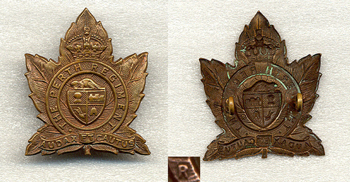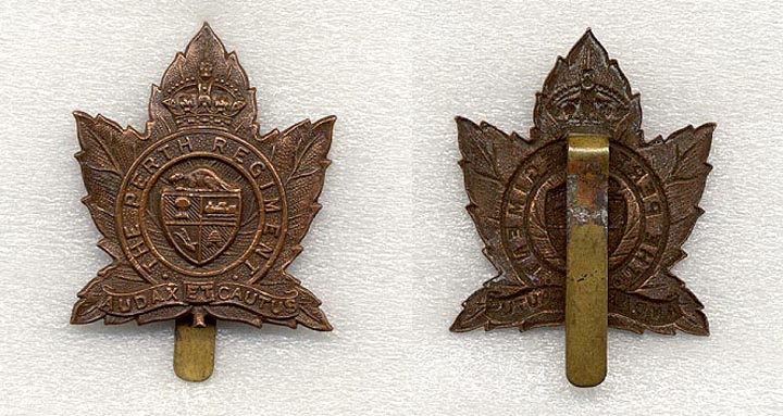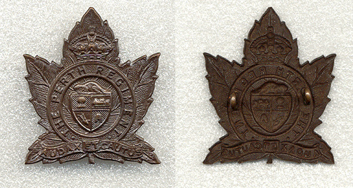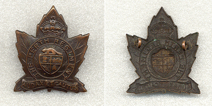 The Perth Regiment did not have a regimental button during the war. The book “Buttons of the Canadian Militia” by Eric Smylie incorrectly attributes a black rifle regiment button to the regiment for the period 1920-1952.