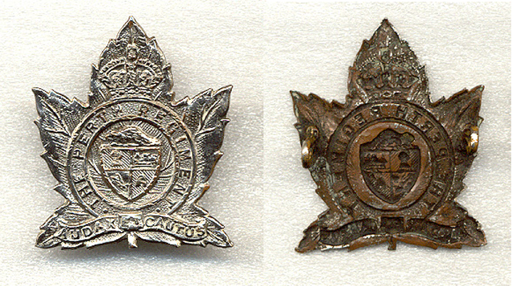 Officers’ cap badges mirrored the pattern worn by other ranks. The primary difference was that they were bi-metal with the crown and scroll being in silver on a brass/gilt maple leaf. Despite the fact that a single company ( Scully Ltd )made most of the badges, there are an interesting number of variations. Unlike the other ranks, officers were not issued badges but were expected to purchase their own.