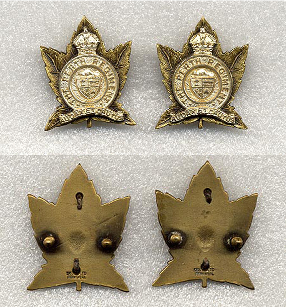 Lettering is larger in the scroll than in later issues. Not as much detail in the veins of the maple leaf. No periods or dots prior to the “T” in The or after the “T” in regiment. No maker marks. This particular badge has had the center “domed” outwards which was commonly done by the soldiers.