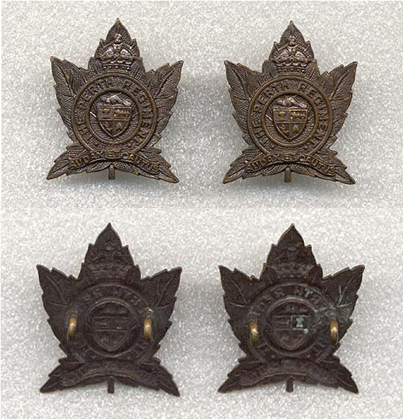 The collar badges worn during this period are essentially a smaller version of the cap badge. Unlike many units that have a different left and right collar, the beaver on the Perth Regiment collars faces the same way (left) when viewing them. The explanation for this is unknown but the additional cost of having different dies made could have been the reason.
