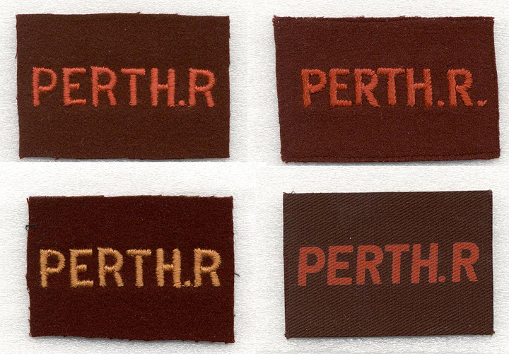 It was expected that all members of the unit wear the PERTHR distinguishing patches on all their uniforms. Due to supply problems it was noted on Mar 24 1944 that regular divisional patches could be worn on greatcoats for “personnel who have not got three sets of Perth patches.”
