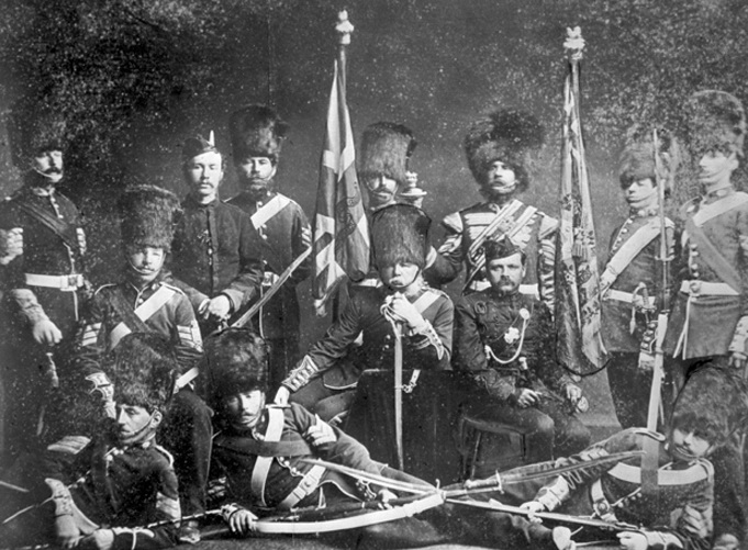 Officers of the Regiment, ca 1885. Note the three officers in cocked hats. These are the Medical Officer, Quartermaster and Paymaster who, as non-combatant officers, did not wear the bearskin cap.
