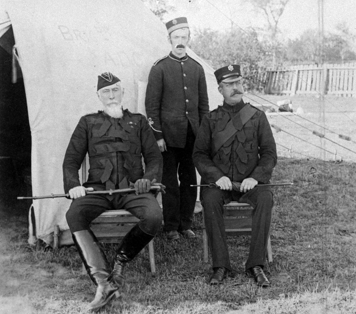 The Commanding Officer, Adjutant and an orderly, ca.1892. Note the Torin cap worn by the Colonel and the two styles of forage cap, bot OR and Officer, worn here. Of interest is the tunic worn by the orderly. Due to limited funds, Militia & Defence could not afford to purchase Guards pattern tunics and provided a quantity of Infantry patern tunics. Some of these were later adapted to double-buttons although the (incorrect) cuffs remained unaltered. MilArt photo archives.