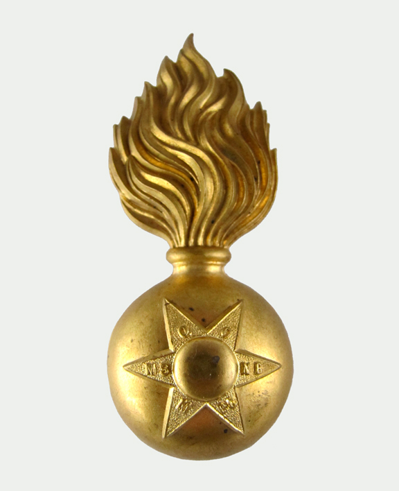 In addition to the bearskin cap, the GGFG wore the variety of headdress authorized by Dress Regulations of the time. In the late 1800s these included the Field Service Cap (Torin pattern), the Forage cap and, for ‘non-combatant’ officers, a cocked hat in lieu of a bearskin.[ii] The use of the Torin cap was interesting as the authorized Field Service Cap for Infantry (from 1898) was the blue ‘Austrian pattern’ cap – similar to the FSC re-introduced in 1937 for wear with Battledress. Another cap was a fur ‘wedge’ style cap worn in Winter. This cap featured an unusual badge (for the GGFG) in that it is based on a Fusiliers grenade.