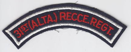 During the Second World War, the 31st (Alta.) Recce. Regt. embarked on what can only be described as an odyssey in their efforts to acquire an officially approved embroidered title. The new unit was organized on March 18, 1942 and drew heavily on volunteers from the 15th Alberta Light Horse and the 19th Alberta Dragoons. Discussions between the two reserve regiments and the Officer Commanding the 31st resulted in a request that the 31st be granted permission to wear the 15th Alberta Horse cap badge, while the 19th Dragoons cap badge would be worn in the manner of cavalry units, on the chevrons or sleeves of the senior NCOs. By established policy, the shoulder title would be based on the authorized unit designation. It appears the rationale behind unit designations and insignia had not been clearly communicated at all senior levels. In February, 1943, Maj.-Gen. J.V. Young , Master General of the Ordnance (MGO), noted that the unit designation did not reflect the parent regiments, and suggested that the designation be changed to the 31st (15th/19th Alberta) Reconnaissance Regiment. This would connect the cap badges to the unit, and this designation would be the basis for shoulder insignia.[1]