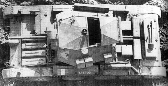 An overhead view of a Covenanter I, in British service, bearing British War Department number T18703, which was built under Contract number T.7219, by English Electric Valve Co., showing the driver’s hatch in the closed position, and the turret full-width top hatch, in the open position. The three small external stowage bins, on the left-side of the turret, each held two 100 round drums of .303-inch ammunition, for the anti-aircraft/ground defence, .303-inch Bren light machine gun. The long bin on the right-side of the turret, was for the stowage of the .303-inch Bren light machine gun, when not in use. The marking on the front left-side of the turret, is that of the British Royal Armoured Corps Gunnery School, which was located at Lulworth Camp, Dorset. Source: authors’ collection.