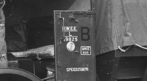 A close-up of the Vulcan. The marking shows the truck belongs to the Mechanized Wheeled Experimental Establishment and was the 825th vehicle purchased in 1919. MilArt photo archives