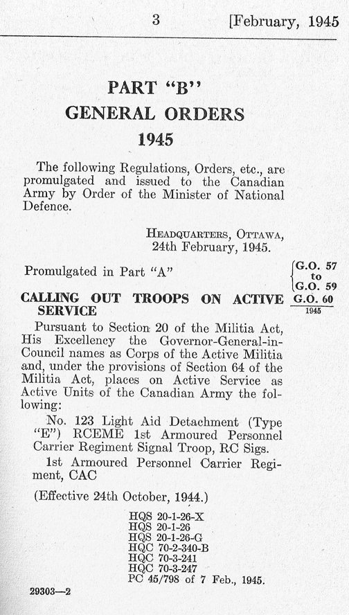 General Order Number 60 of 1945, under which the embodiment of 1st Canadian Armoured Personnel Carrier Regiment, Canadian Armoured Corps, 1st Canadian Armoured Personnel Carrier Regiment Signal Troop, Royal Canadian Corps of Signals, and No. 123 Light Aid Detachment (Type E), Royal Canadian Electrical and Mechanical Engineers, was officially announced by Army Headquarters, Ottawa, on page 3 of Part “B” General Orders 1945, dated 24 February 1945. Authors’ collection
