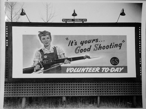 A photograph of an actual roadside billboard. Here a female factory worker, presumably from Long Branch, offers a Lee-Enfield rifle. The billboard plays on the “GS” badge which represented General Service (denoting a volunteer who has indicated a willingness to serve overseas) with Good Shooting.