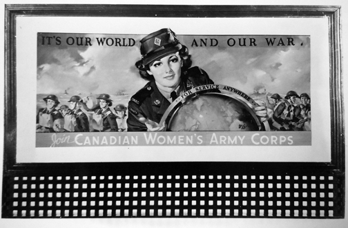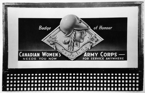 This final mock up tugs on the patriotic heartstrings of young women. The badge is the result of an artist taking liberties with the CWAC cap badge.