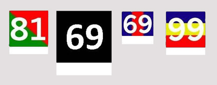 Artistic illustrations of the ‘Arm of Service’ markings for, from left to right, Headquarters, 2nd Canadian Armoured Brigade (Independent), 6th Canadian Armoured Regiment (1st Hussars), 10th Canadian Armoured Regiment (The Fort Garry Horse), and 27th Canadian Armoured Regiment (The Sherbrooke Fusilier Regiment), all with the horizontal 2-inch (5-centimetre) high white bar added to the bottom (denoting ‘Army Troops’), as described in the text. Source: author