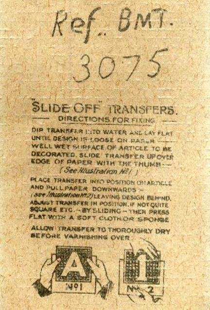 The directions on the reverse of a water-based decal (or transfer) sheet, in this case for Catalogue Number BMT 3075, which was for a small Royal Canadian Ordnance Corps, ‘Arm of Service’ background of three vertically equally divided bars of blue/red/blue, onto which the Arm of Service Serial number would be applied in paint, as described in the text. Source: authors’ collection.