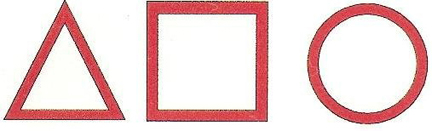 Artistic illustrations of the geometric markings used to identify squadrons within an armoured regiment, from left to right, “A” Squadron (a triangle, point upwards), “B” Squadron (a square), and “C” Squadron (a circle). The senior armoured regiment used red for their squadrons’ markings, the intermediate armoured regiment used yellow for their squadrons’ markings, and the junior armoured regiment used blue for their squadrons’ markings. Source: author