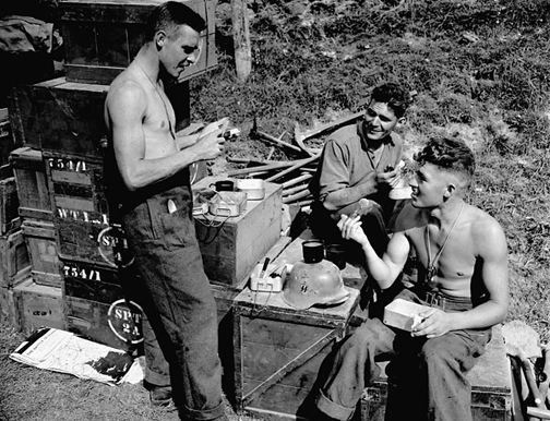 The following images are some examples of soldiers’ kit bags, and unit stores, onto which a unit mobilization serial number as been applied, as a form of unit identification. The first image is of a kit bag belonging to a Trooper L.A. Watts, which is marked with the unit mobilization serial number ‘570/1,’ which although rather faded, appears near the top opening of the bag, and identifies the kit bag owner as a member of the 1st Canadian Armoured Car Regiment (Royal Canadian Dragoons), Canadian Armoured Corps, whose unit mobilization serial number was ‘570/1.’ Note the application of the three horizontal bars of the coloured bar code system near the bottom of the bag. The second image is of a kit bag marked with the unit mobilization serial number ‘743/1,’ thus identifying the kit bag owner as a member of Le Regiment de la Chaudiere, whose unit mobilization serial number was ‘743/1.’ Again, the three horizontal bars of the coloured bar code system appear applied directly below the unit mobilization serial number, along with one vertical coloured bar, which was added by the regiment, too perhaps, identify the sub unit of the battalion to which the kit bag owner belonged (for the organization of an infantry battalion, please see the MilArt article “Basic Organization of the Canadian ‘Infantry (Rifle) Battalion’ on Overseas Service during the Second World War,” of 7 March 2014). In the last image, three soldiers of the Highland Light Infantry of Canada are having a meal in the area of Thaon, France, on 6 August 1944. Note the two stacked, dark coloured stowage boxes, to the left-rear of the standing soldier, both of which are marked with the Highland Light Infantry of Canada’s unit mobilization serial number of ‘754/1.’ Also note the application of the three horizontal bars of the coloured bar code system, which are applied directly below the unit mobilization serial number, on both stowage boxes.