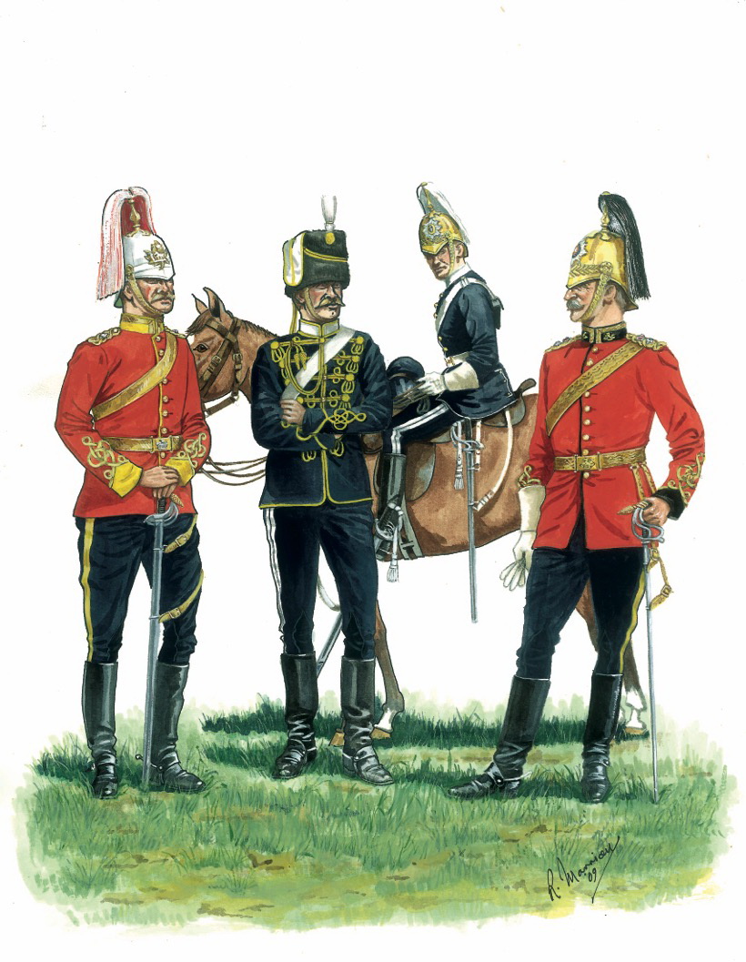 Other cavalry units all wore various types of dragoon uniforms; some had dark blue tunics (all of which were faced with white), others had scarlet tunics with distinctive regimental facings. All had dark blue trousers with white or yellow stripes. A few units had a squadron or a squad or just some officers in full dress while most men wore serge frocks and peaked caps. For regiments wearing dark blue, the serge frock was the same as for hussars. For regiments wearing scarlet, their scarlet serge frock had a collar of the facing colors (all had yellow facings except myrtle green for the 9th and black for the 26th). From 1909, all frocks had shoulder straps of the facing color. A few of the lesser known units are here presented.