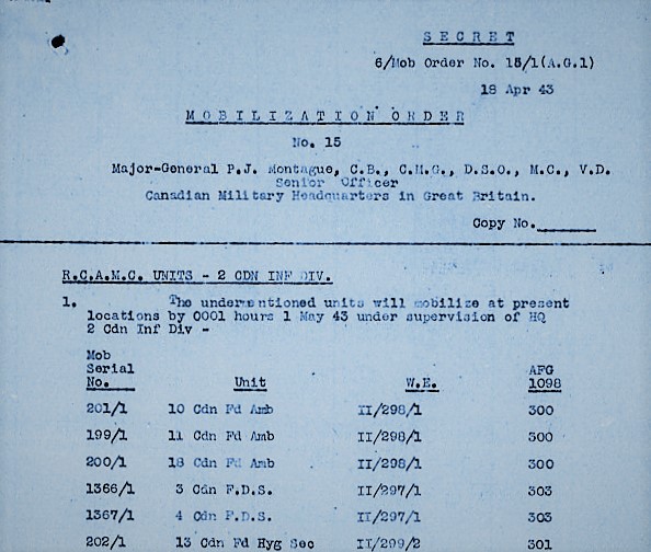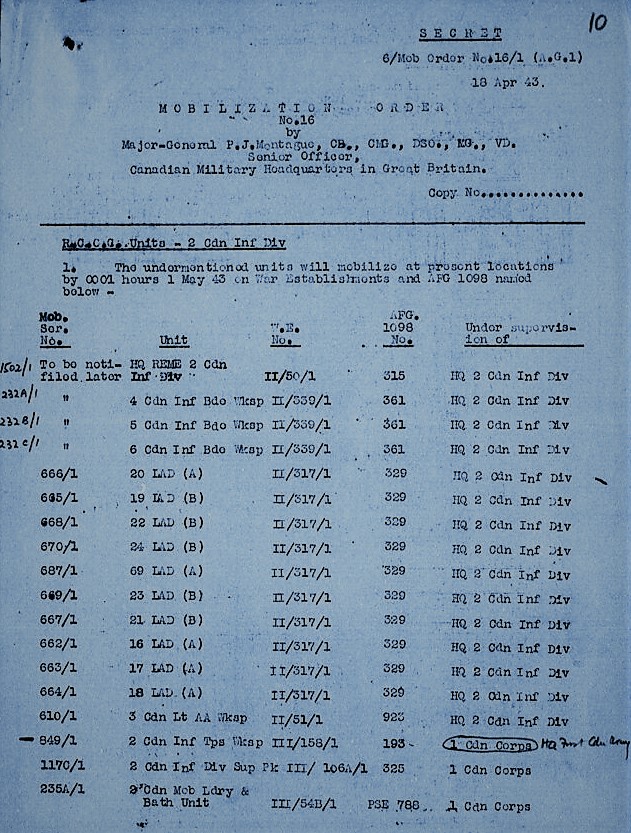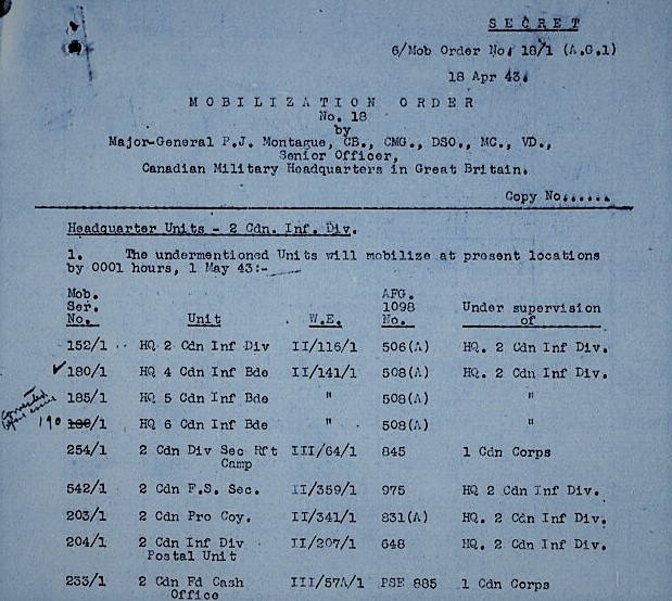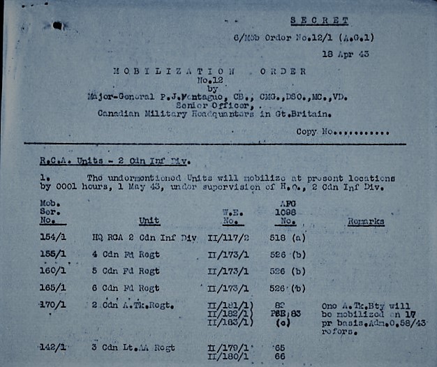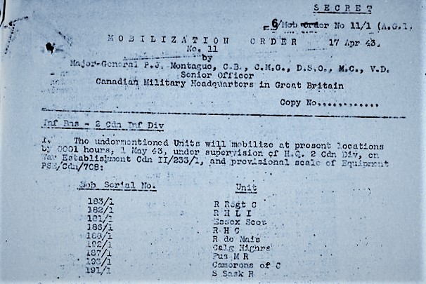 The Author wishes to thank Mike Reintjes for putting the idea to write this, and following articles, on the series of Canadian Army Mobilization Orders which began to be issued to the Canadian Army Overseas by Canadian Military Headquarters (London), as the possibility of active operations approached in the spring of 1943. I wish to also thank Richard Law for publishing this article.