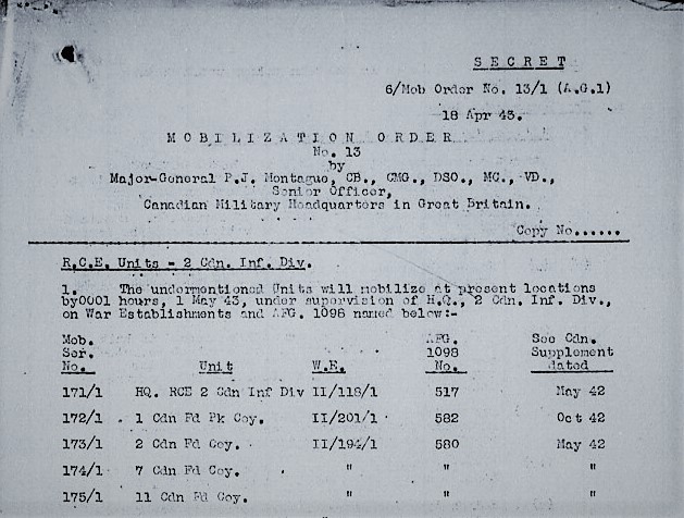 Under Mobilization Order No. 13, dated 18 April 1943, with effect from 1 May 1943, the following RCE units of the 2nd Canadian Infantry Division were mobilized in the United Kingdom under the supervision of Headquarters, 2nd Canadian Infantry Division:
