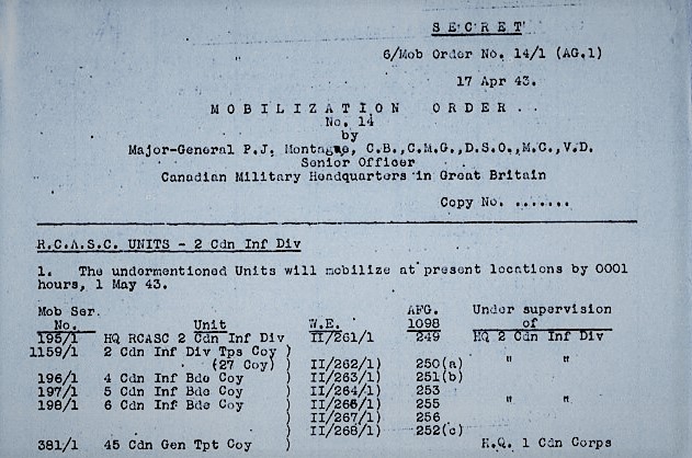 Under Mobilization Order No. 14, dated 17 April 1943, with effect from 1 May 1943, the following RCASC units of the 2nd Canadian Infantry Division were mobilized in the United Kingdom under the supervision of Headquarters, 2nd Canadian Infantry Division:, and Headquarters, 1st Canadian Corps: