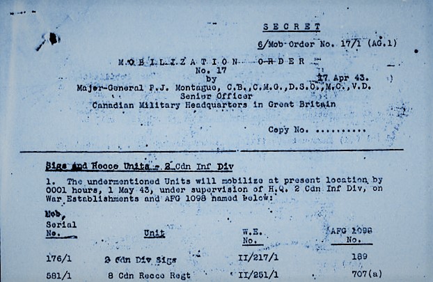 Under Mobilization Order No.17, dated 17 April 1943, with effect from 1 May 1943, the following Sigs and Recce units of the 2nd Canadian Infantry Division were mobilized in the United Kingdom under the supervision of Headquarters, 2nd Canadian Infantry Division: