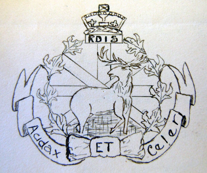 The approved badge. The unit title was replaced with the unit’s Latin motto which translates as ‘It pours forth armed men”.